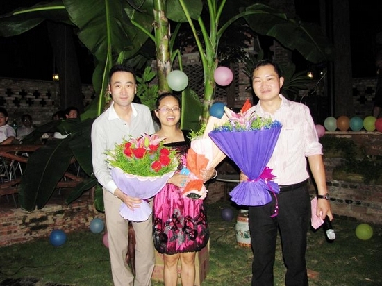 值得一提的是,在寿星们上台、发表感言、抽奖时,天上不断降落甘露,大家都以为是下雨了,不想那水有味道,是啤酒。再一看,原来是甘总一直在恶作剧。大伙都被甘总的创意逗笑了。